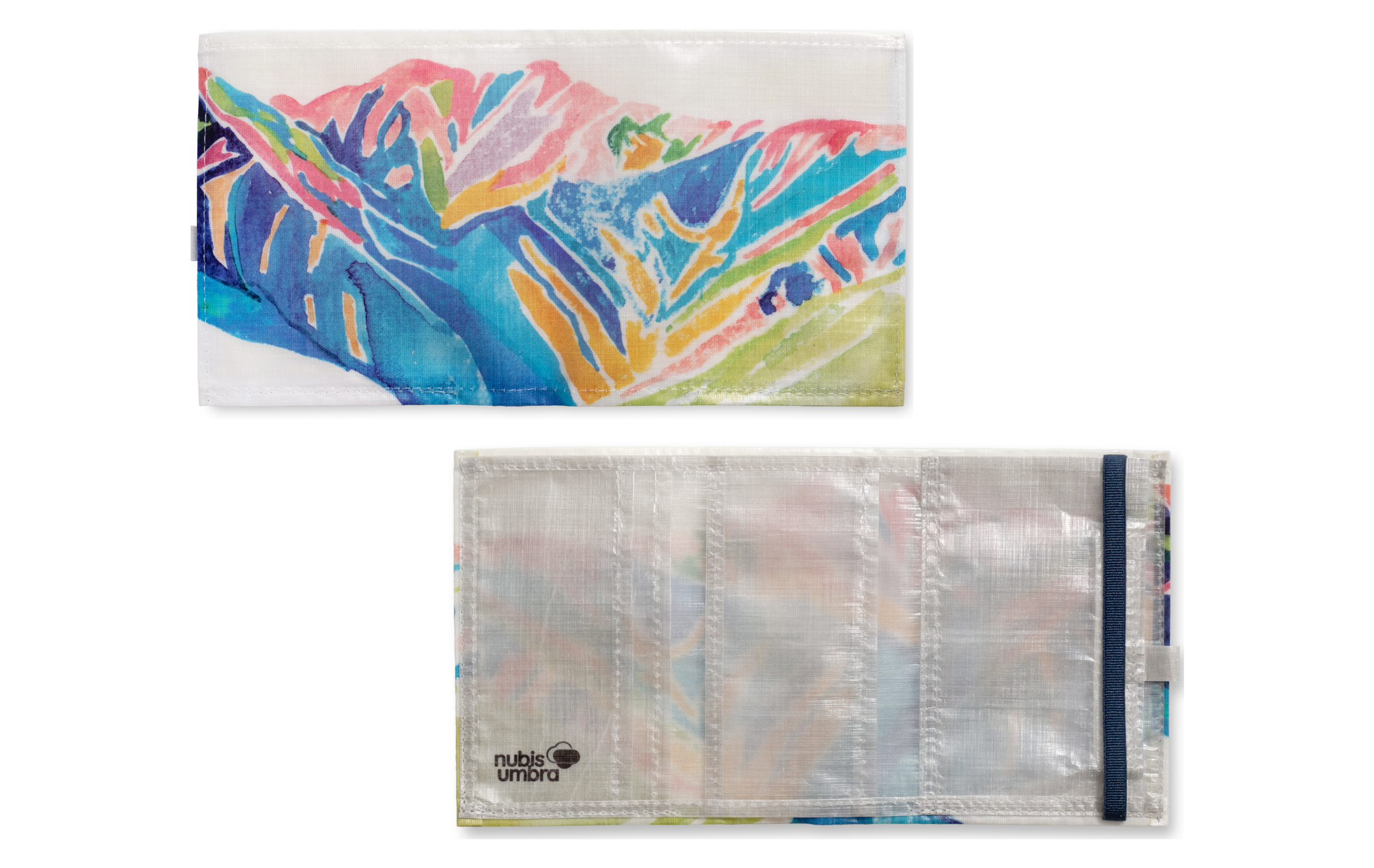 「雲を泳ぐ」では水彩の柔らかいタッチでカラフルに水晶岳が描かれています。