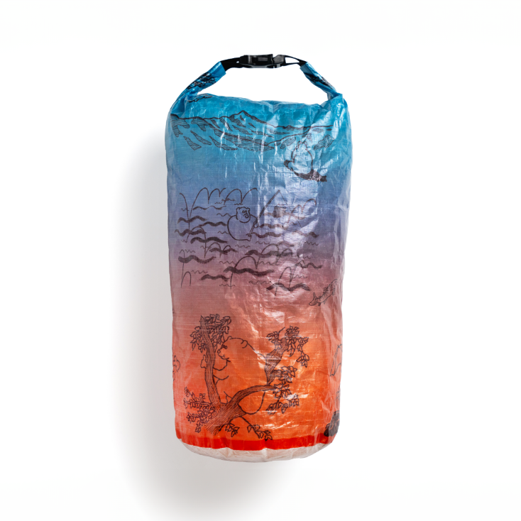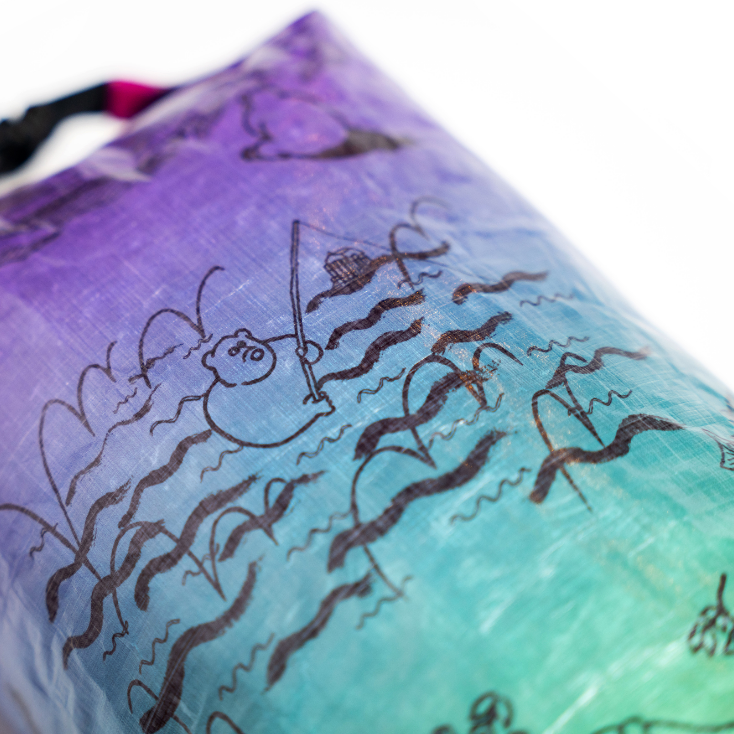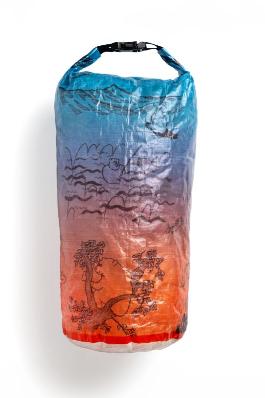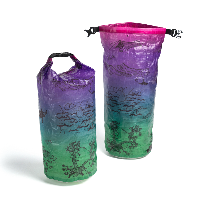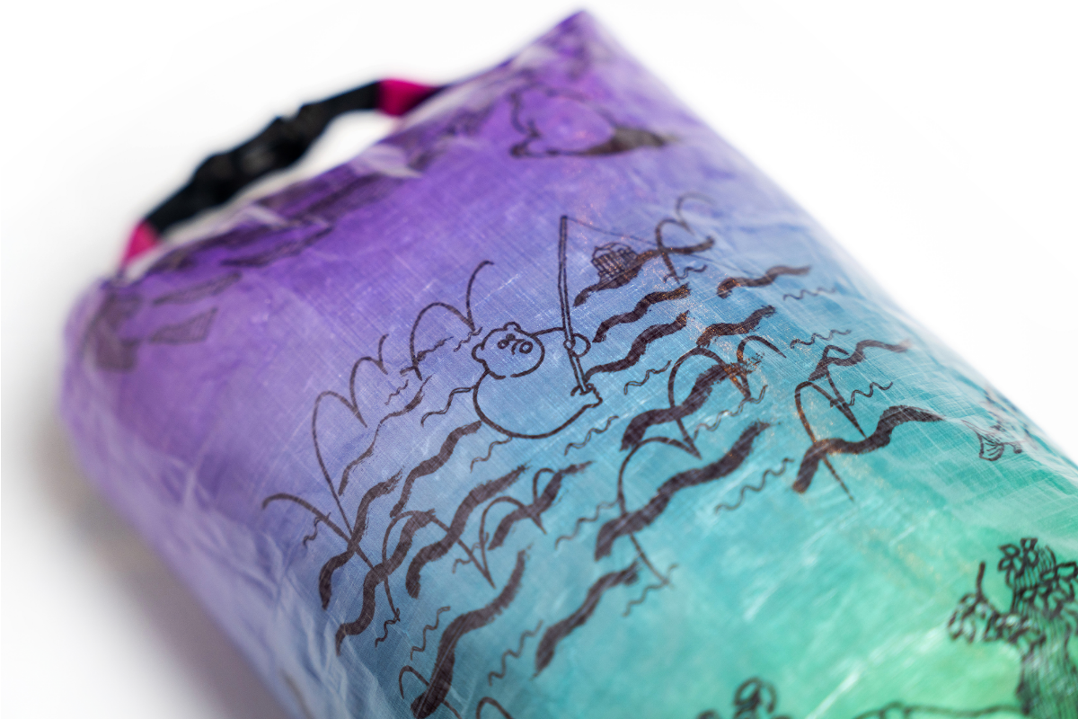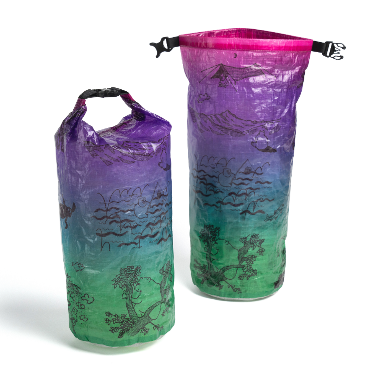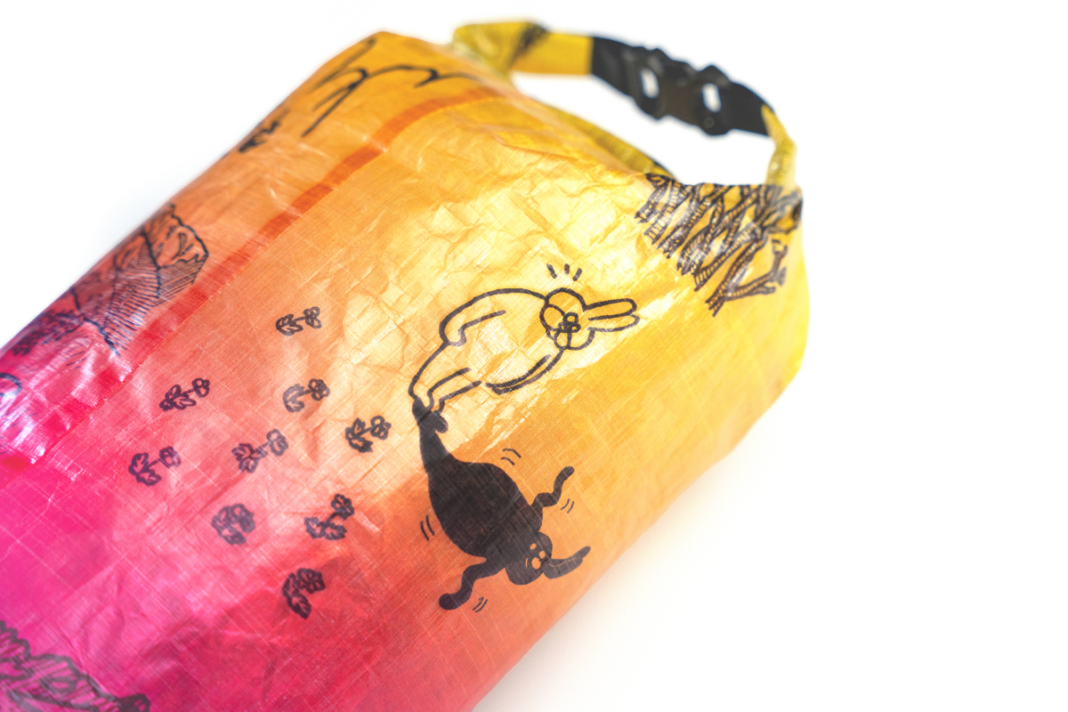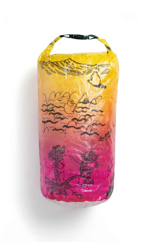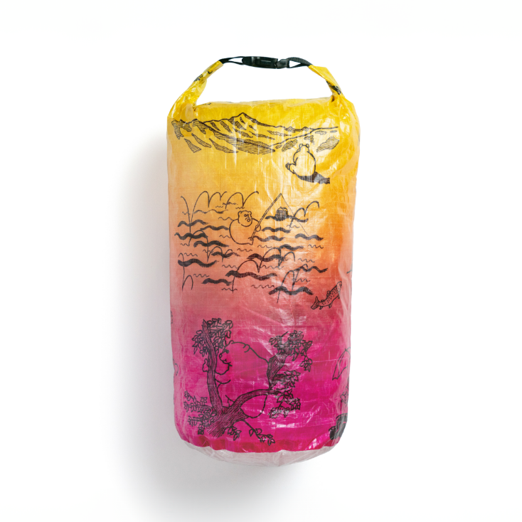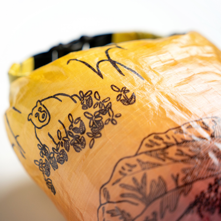 「森版画」同様、超軽量、防水、高耐久生地のDCF(Dyneema Composite Fabric)にプリントを施したスタッフサック「The bear life」が登場です。